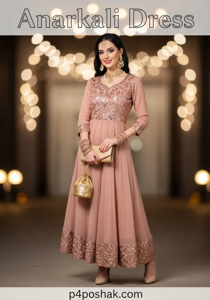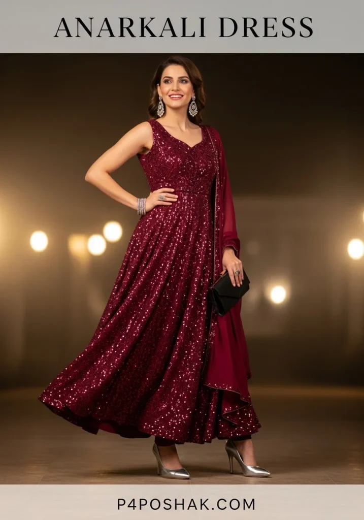 A sparkling anarkali dress that ensures all eyes are on you. The sequins shimmer beautifully under evening lights — ideal for receptions or cocktail nights. (Pro tip: Keep makeup nude to balance the glitz!)