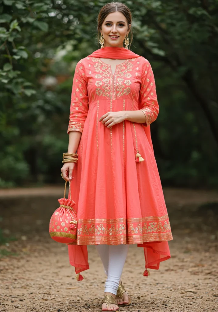 Shop Now from Amazon: Coral Pink Anarkali + White Leggings + Gold Sandals + Pink Potli Bag