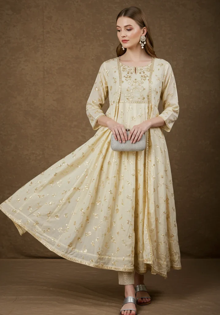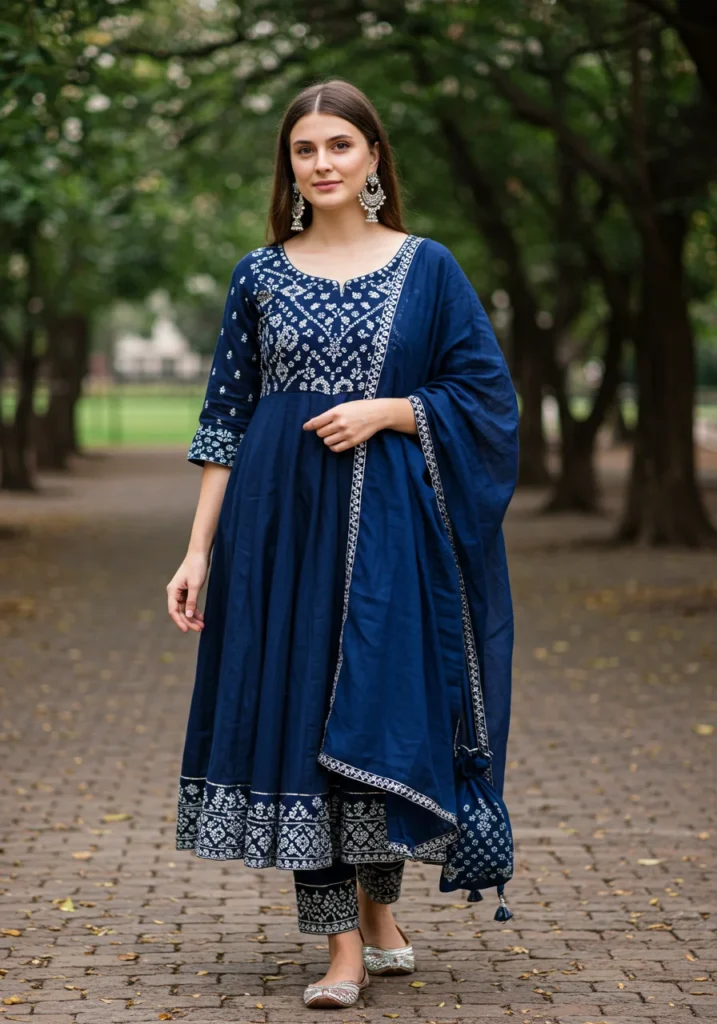 From classic white cotton Anarkalis that define simplicity to stunning silk and georgette designs adorned with zari and sequins — every look adds its own charm to your ethnic journey. My personal tip? Choose an Anarkali that complements your body type and let the flare do the magic. Pair it with delicate jhumkas, statement heels, or even contemporary earrings to give your look a personalized touch.