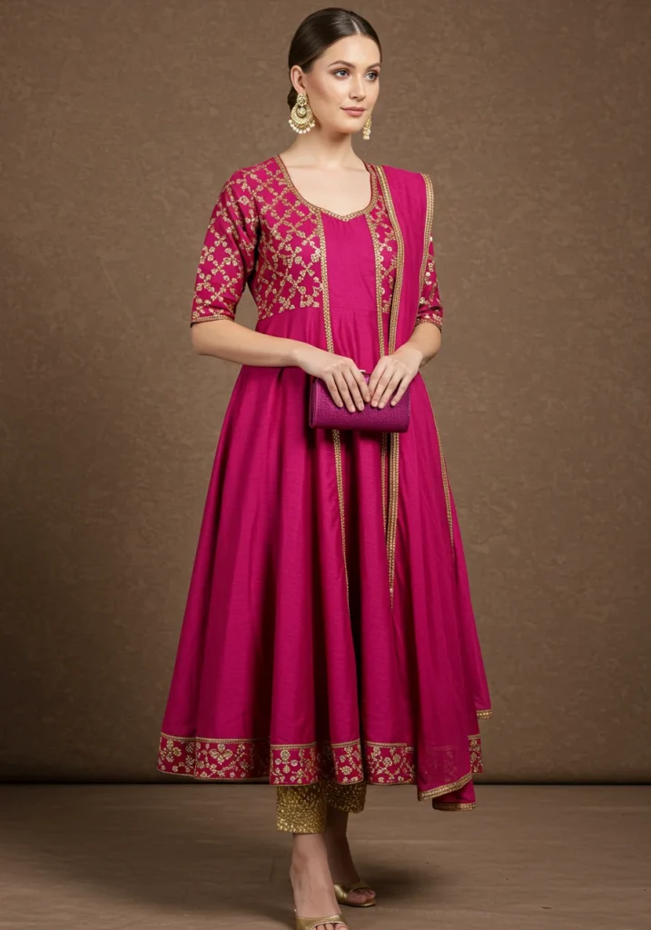 Layered elegance at its best — this Anarkali style flatters every body type. Ideal for family functions, it offers comfort with luxury. (Author Tip: Pair with pearl jewelry for a royal finish.)