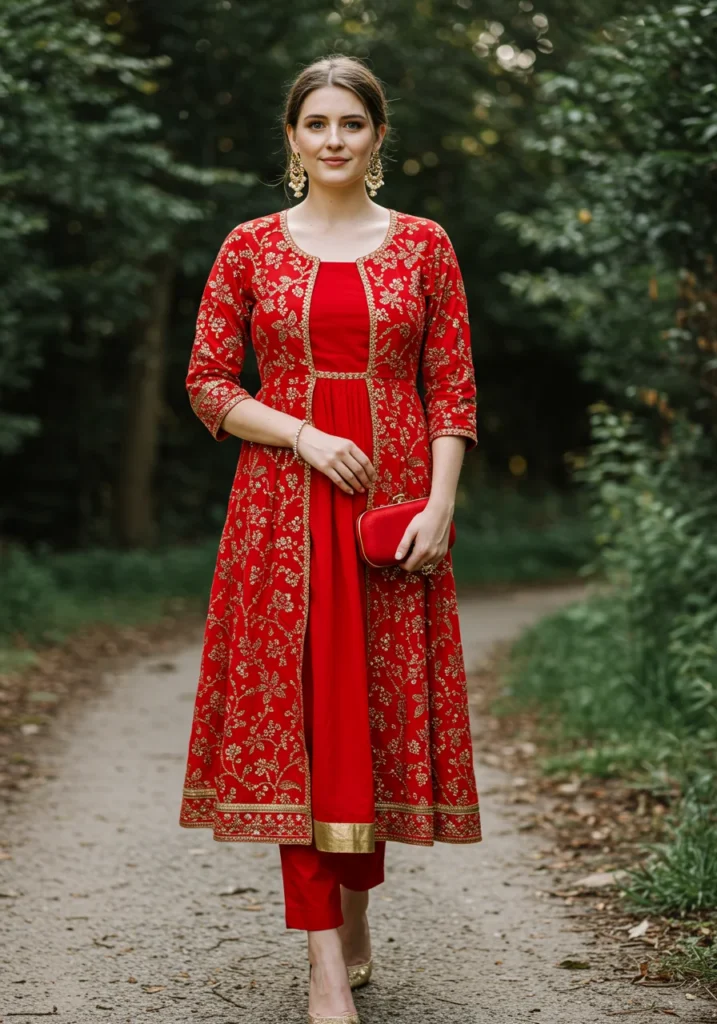 Shop Now from Amazon: Red Anarkali + Red Churidar + Gold Heels + Red Clutch