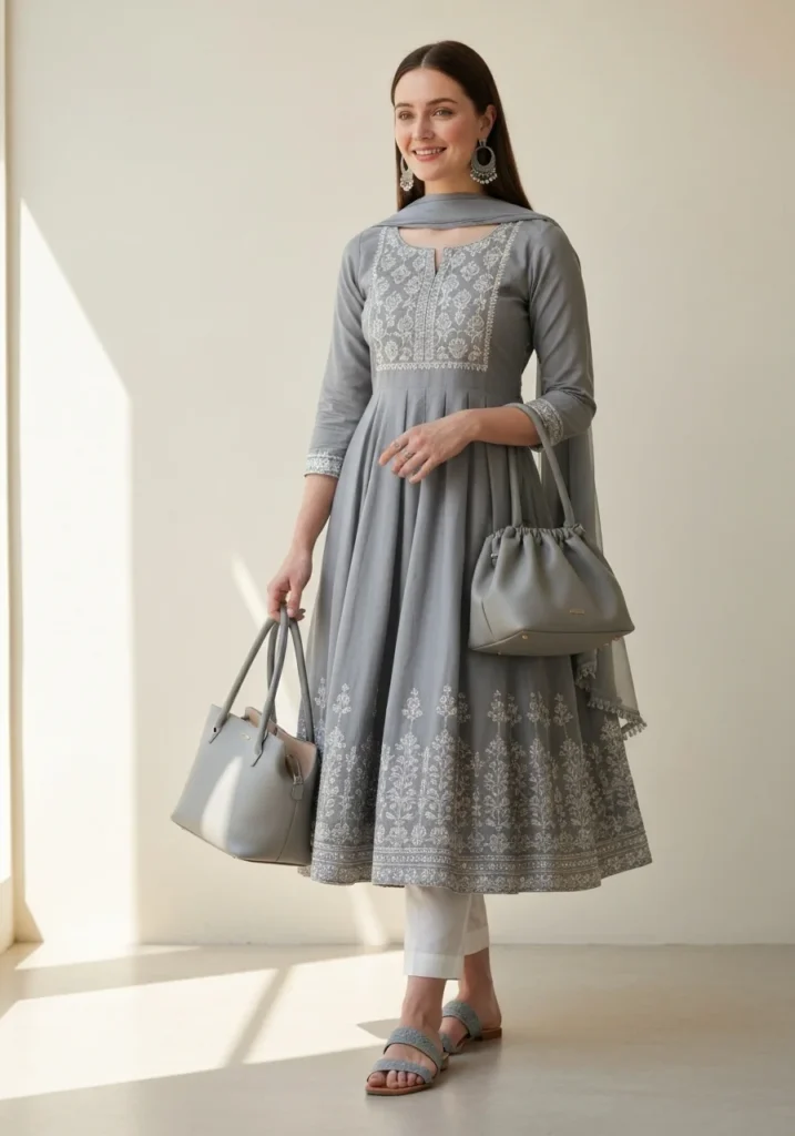 Shop Now from Amazon: Grey Anarkali + White Pants + Grey Sandals + Grey Bag