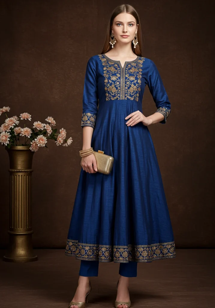 This luxurious blue Anarkali is all about regal sophistication. Its silk texture adds shine and depth, ideal for weddings or evening receptions. (Author Tip: Pair with gold jhumkas for a royal touch!)