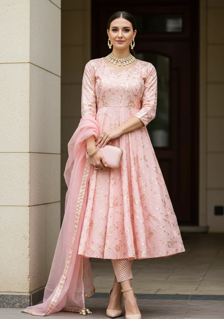 A soft pastel pink Anarkali Salwar Kameez radiates subtle charm. The flowing georgette fabric ensures comfort and movement, making it perfect for festive brunches or engagement parties. (Check Nykaa Fashion for pastel trends.)