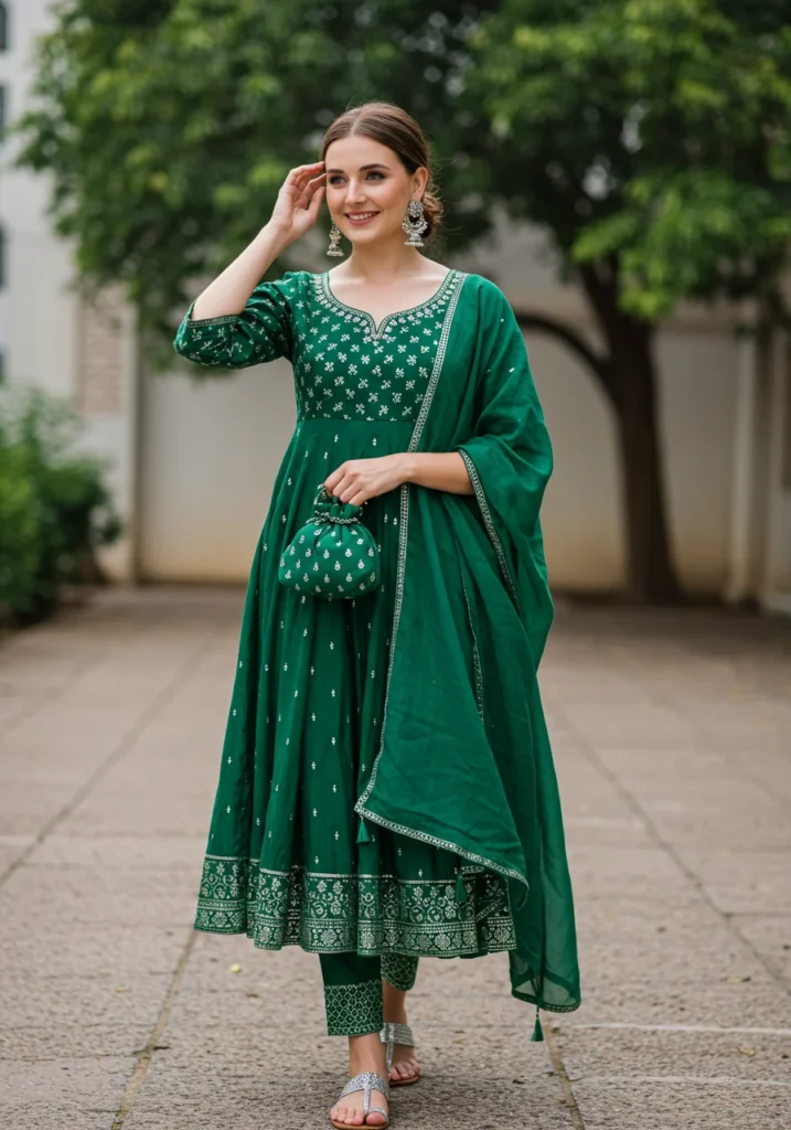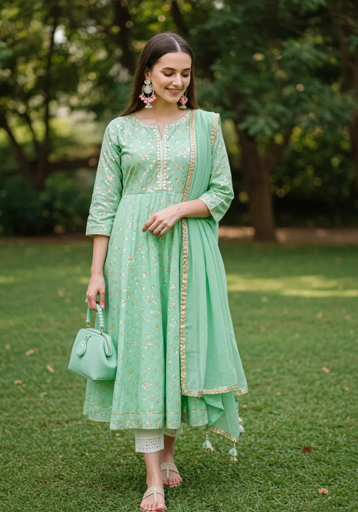 For an earthy, grounded vibe, this olive green cotton Anarkali is unbeatable. It’s comfortable for travel or office wear while maintaining an ethnic elegance.