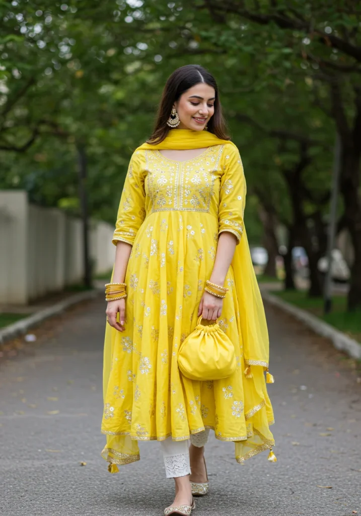 Shop Now from Amazon: Lemon Yellow Anarkali + White Pants + White Flats + Yellow Bag