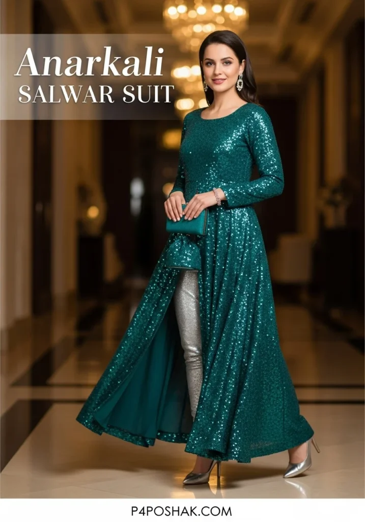 Teal sequined anarkali salwar suit sparkles elegantly at receptions. Sequins catch the light beautifully, making it ideal for evening events. Tip: Pair with minimal accessories to avoid an overpowering look.