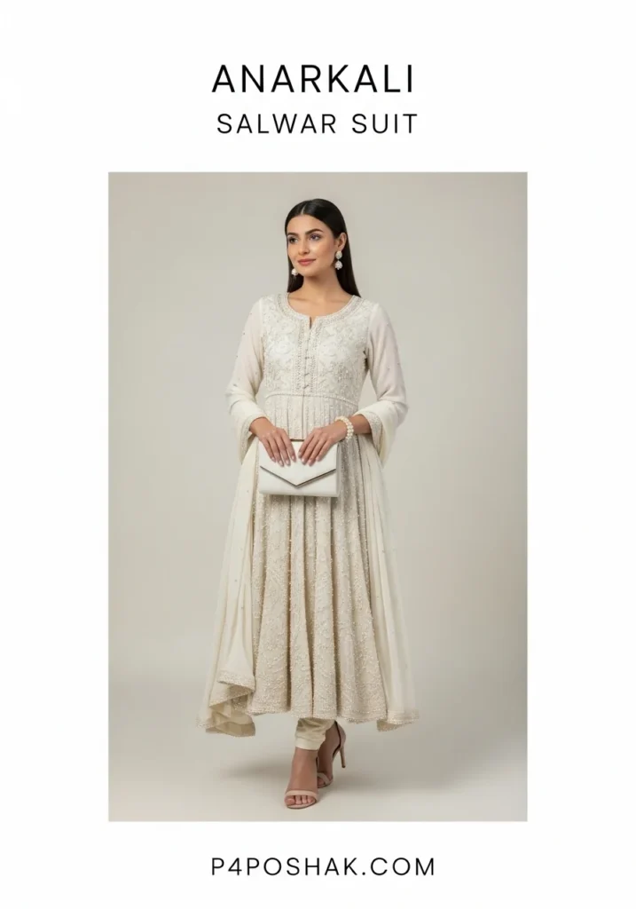 Ivory pearl embellished anarkali salwar suit offers understated luxury. Pearls add texture without weighing the outfit, making it perfect for cocktail or formal evening parties. Author experience: Subtle elegance wins every time.