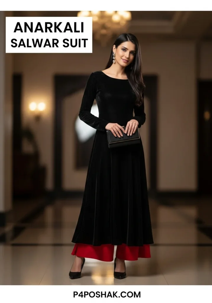 Black velvet full sleeve anarkali salwar suit is perfect for formal evening events. Luxurious fabric ensures elegance, while full sleeves add a sophisticated touch. Author advice: Keep hairstyle sleek to enhance drama.
