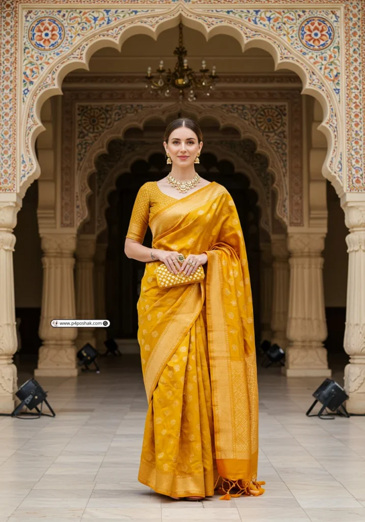 Shop Now from Amazon: Mustard Yellow Banarasi Silk Saree + Yellow Silk Blouse + Yellow Silk Petticoat + Yellow Silk Heels + Yellow Silk Clutch