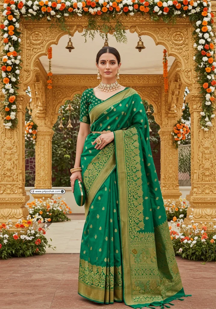 Shop Now from Amazon: Emerald Green Banarasi Silk Saree + Green Silk Blouse + Green Silk Petticoat + Green Silk Heels + Green Silk Clutch