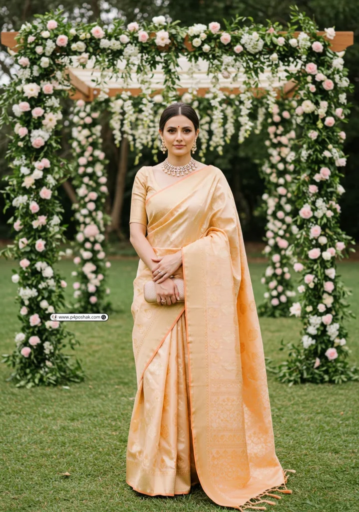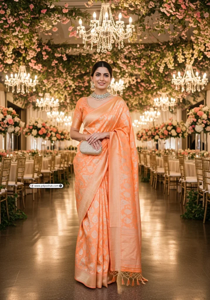 Shop Now from Amazon: Peach Champagne Banarasi Silk Saree + Peach Silk Blouse + Peach Silk Petticoat + Peach Silk Heels + Peach Silk Clutch