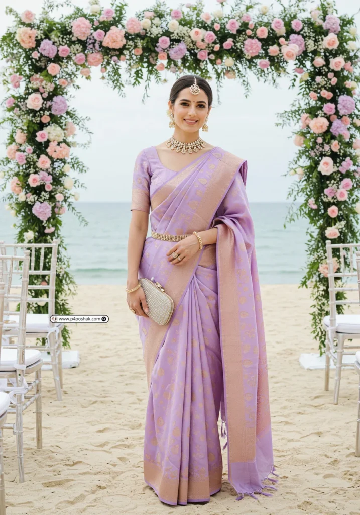 Shop Now from Amazon: Lavender Banarasi Silk Saree + Lavender Silk Blouse + Lavender Silk Petticoat + Lavender Silk Heels + Lavender Silk Clutch