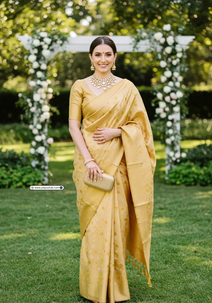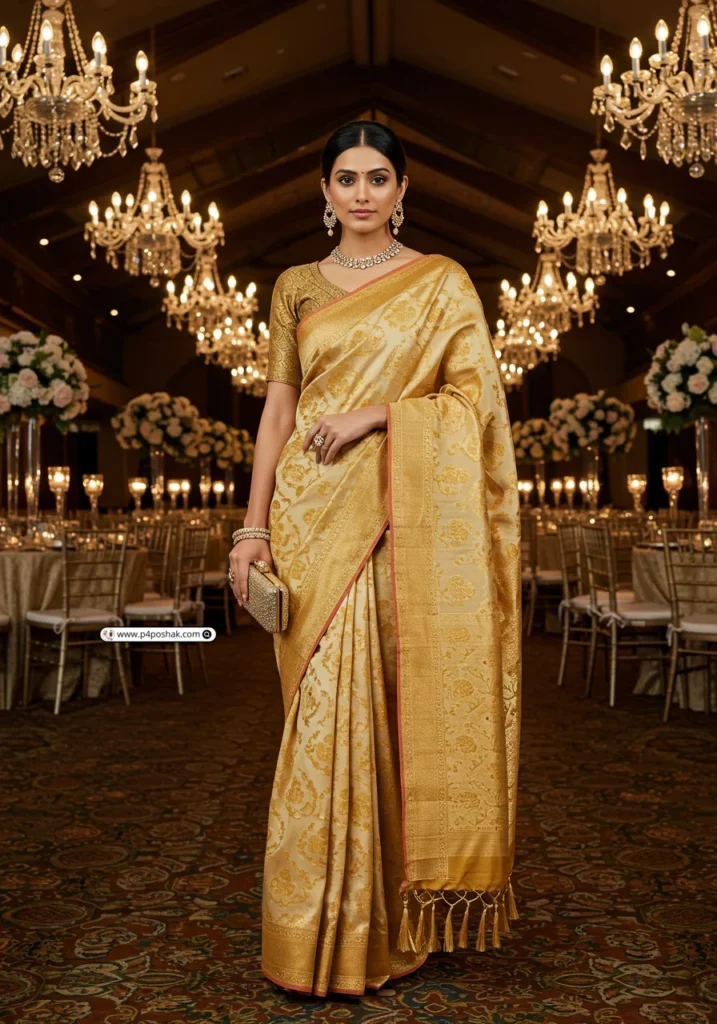 Shop Now from Amazon: Champagne Gold Banarasi Silk Saree + Gold Silk Blouse + Gold Silk Petticoat + Gold Silk Heels + Gold Silk Clutch