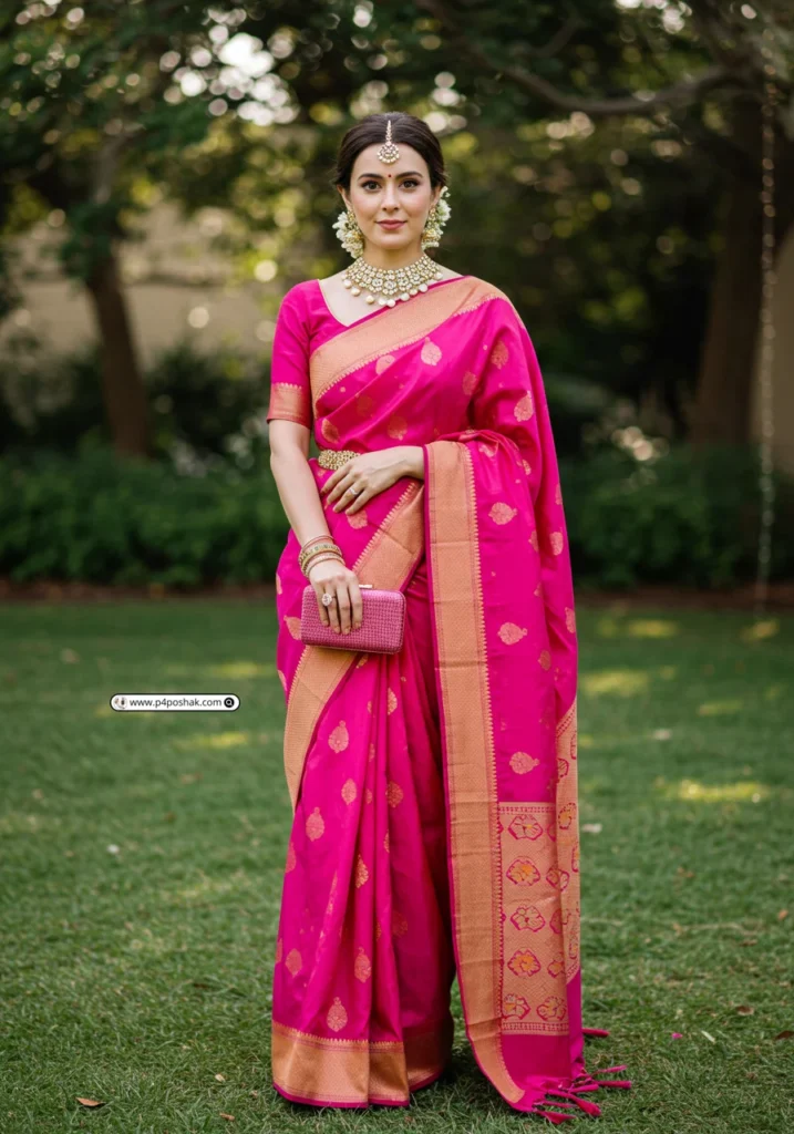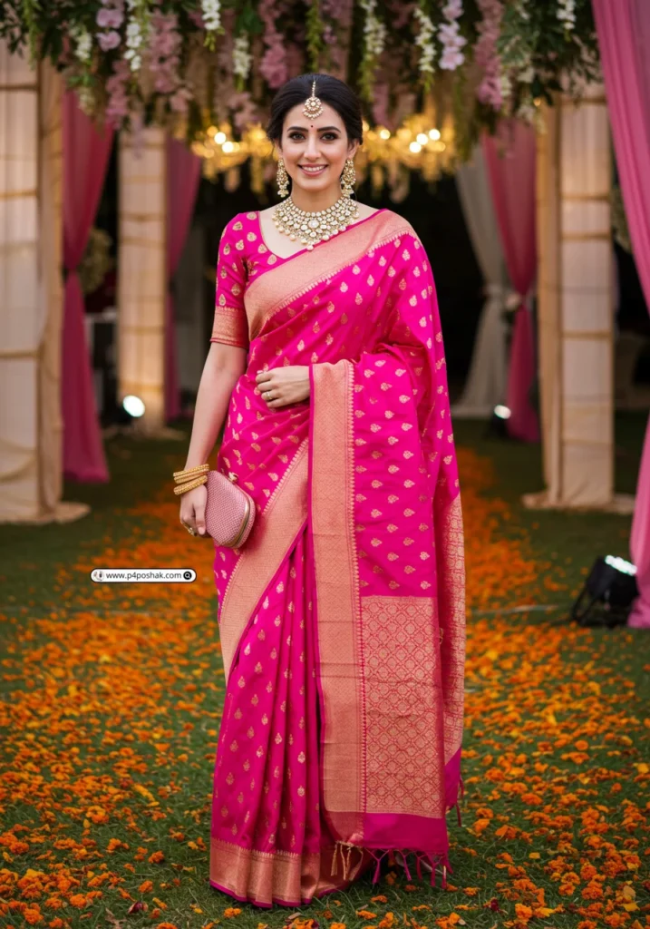 Shop Now from Amazon: Magenta Pink Banarasi Silk Saree + Pink Silk Blouse + Pink Silk Petticoat + Pink Silk Heels + Pink Silk Clutch