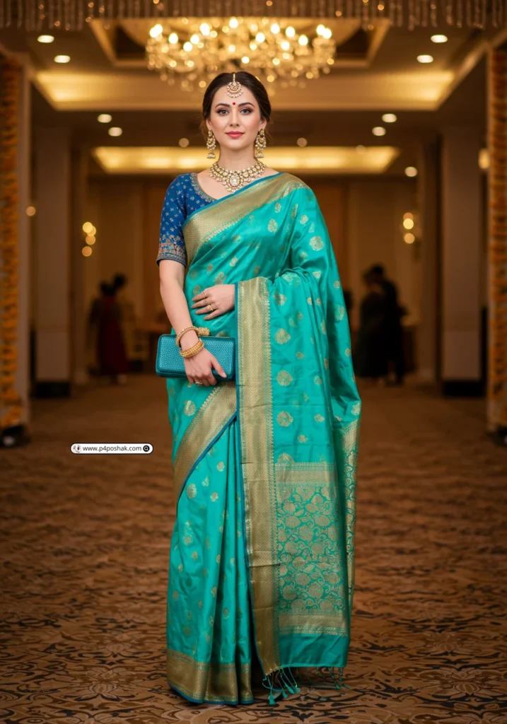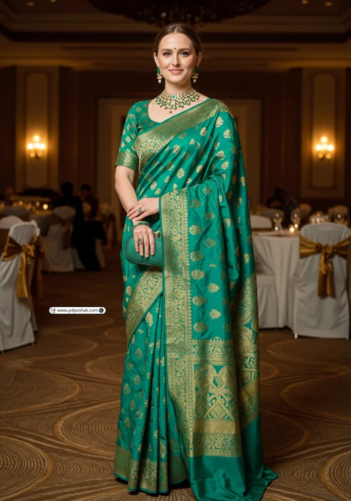 Shop Now from Amazon: Teal Green Banarasi Silk Saree + Green Silk Blouse + Green Silk Petticoat + Green Silk Heels + Green Silk Clutch