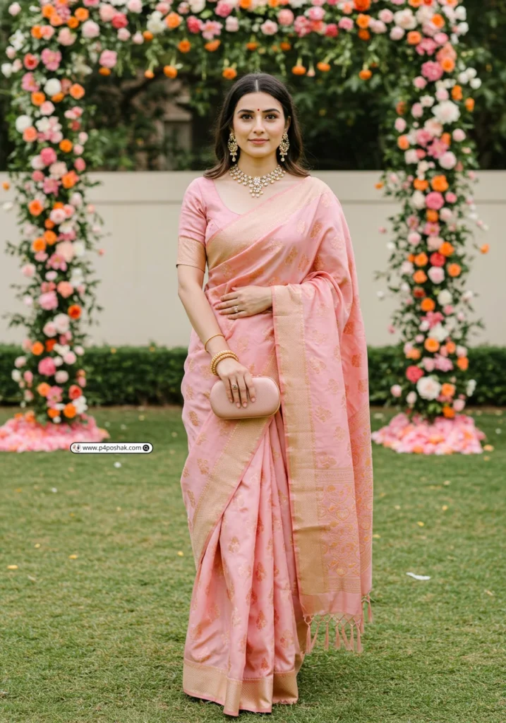 Shop Now from Amazon: Pastel Pink Banarasi Silk Saree + Pink Silk Blouse + Pink Silk Petticoat + Pink Silk Heels + Pink Silk Clutch