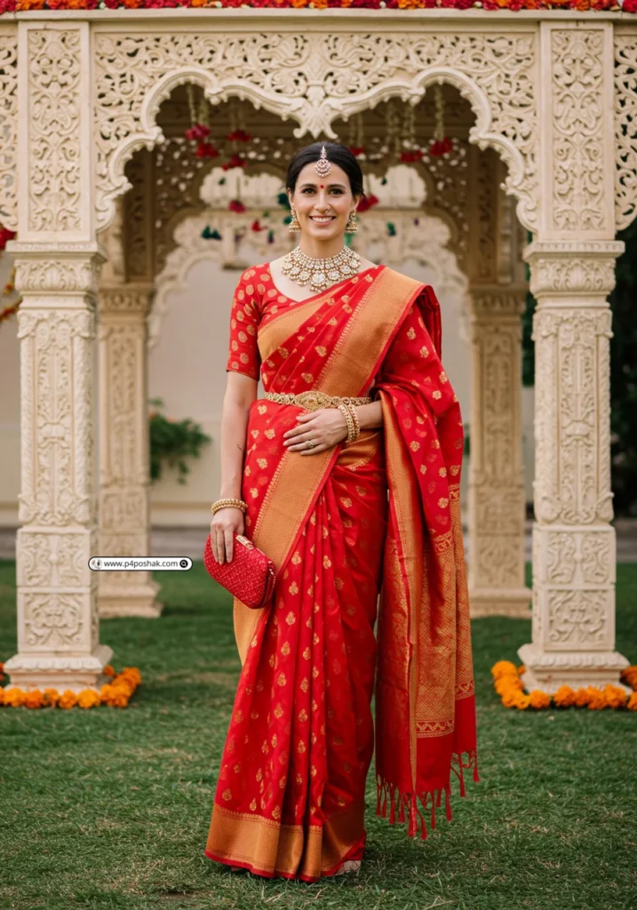 The scarlet red Banarasi saree is a bold and traditional choice for brides. The bright red hue and intricate zari work create a regal and timeless look. Pair with gold jewelry to complement the ensemble.