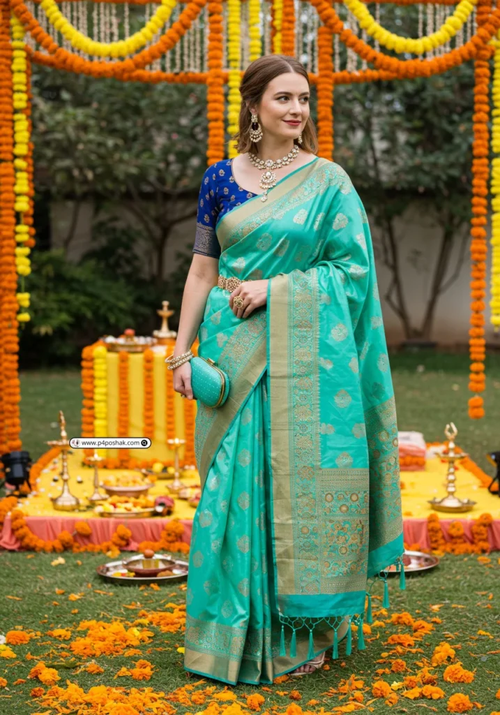 The turquoise blue Banarasi saree is a refreshing choice for brides or guests. The bright blue hue and intricate zari work create a cheerful and elegant look. Pair with silver jewelry for a modern touch.