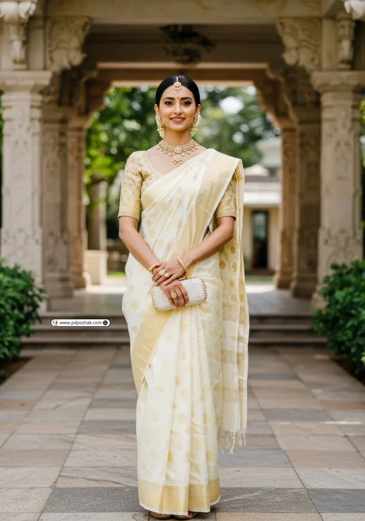 Shop Now from Amazon: Ivory White Banarasi Silk Saree + White Silk Blouse + White Silk Petticoat + White Silk Heels + White Silk Clutch