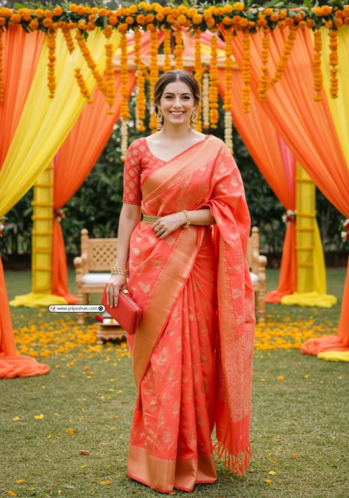 The coral red Banarasi saree is a vibrant and youthful choice for brides or guests. The bright hue and delicate zari work create a cheerful and festive look. Pair with silver jewelry for a modern touch.