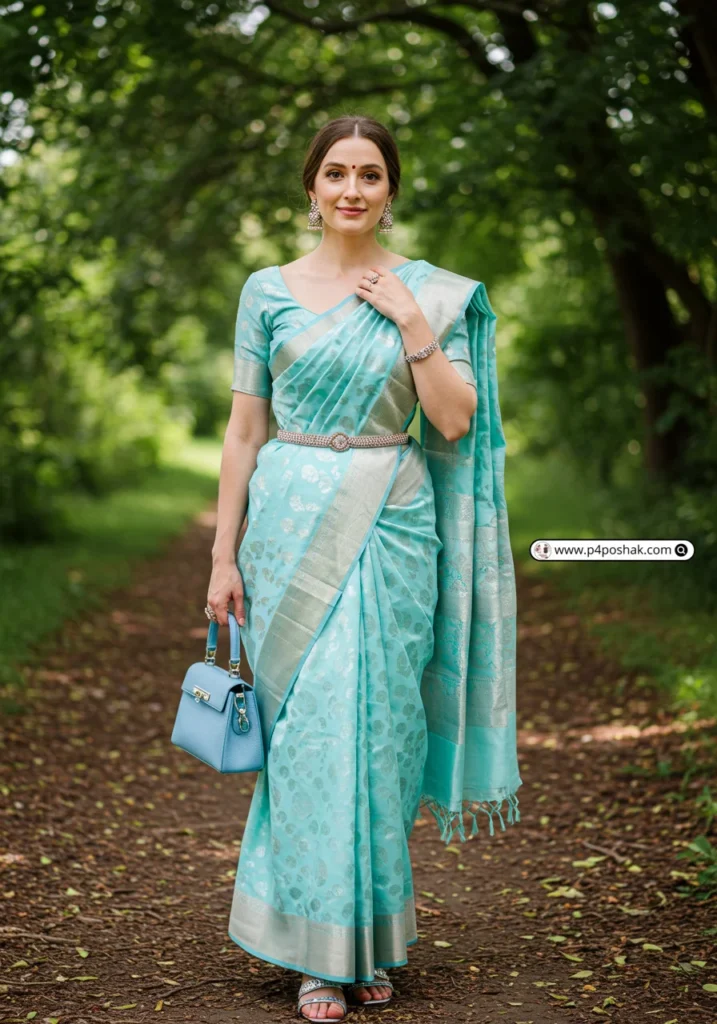 Shop Now from Amazon: Light Blue Banarasi Silk Saree + Silver Blouse Piece + Silver Sandals + Blue Handbag