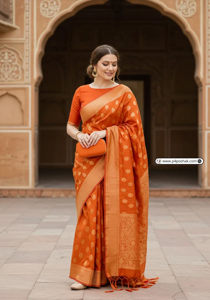 This rust orange Banarasi silk saree features floral zari work, ideal for cultural events and traditional ceremonies. The warm hue adds richness while keeping it festive and comfortable.