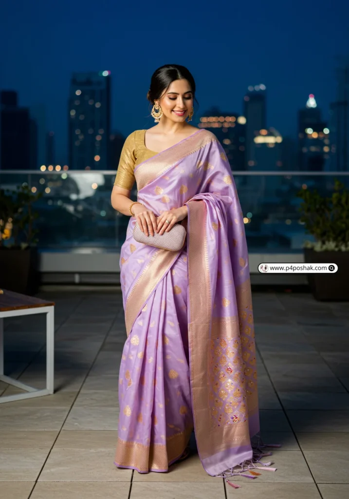 A soothing lavender Banarasi silk saree with a golden border, perfect for formal gatherings and evening parties. Its subtle hue exudes sophistication and understated charm.