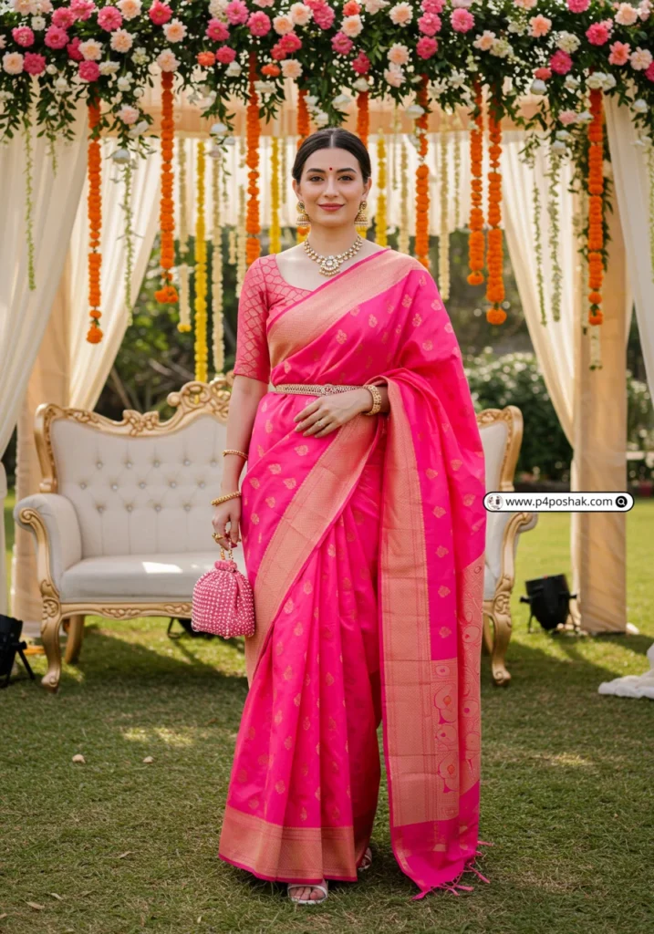 A vibrant bright pink Banarasi silk saree with floral zari work, ideal for festive occasions and weddings. Its lively color ensures you stand out beautifully at celebrations.