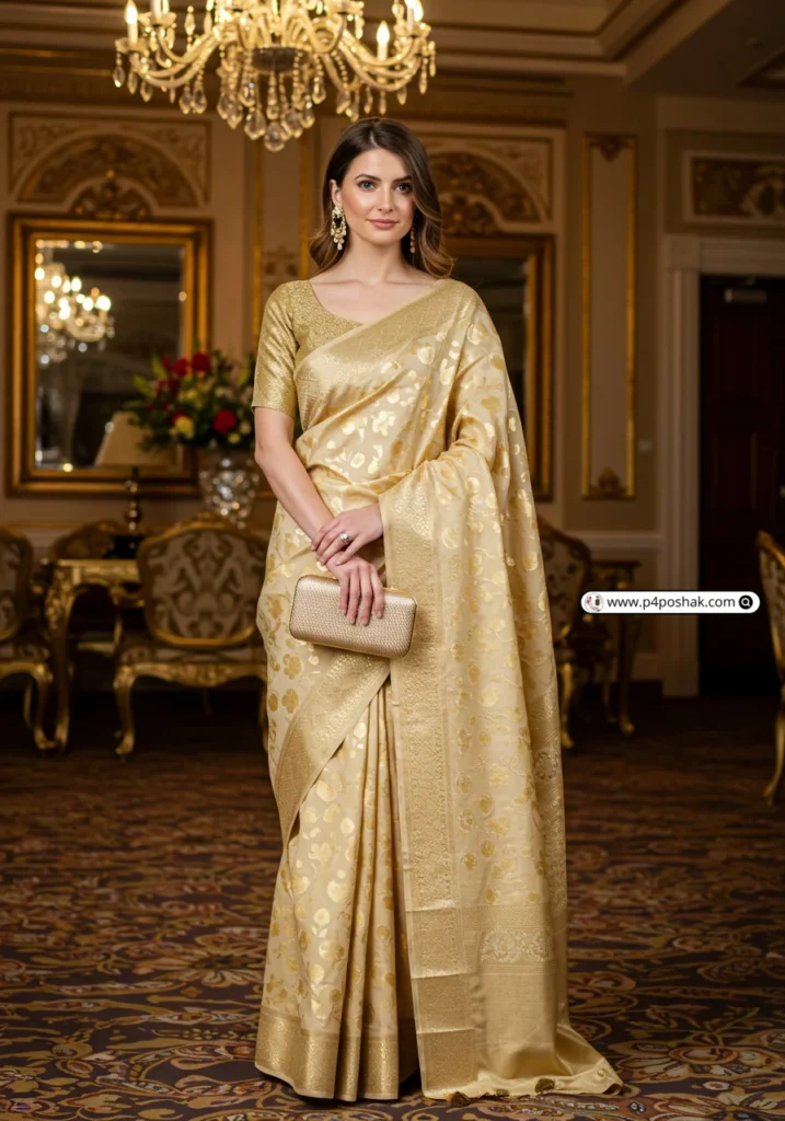 A beige Banarasi silk saree with golden zari work, suitable for formal occasions and evening parties. Its minimalist style and refined texture make it an effortless pick for elegant looks.