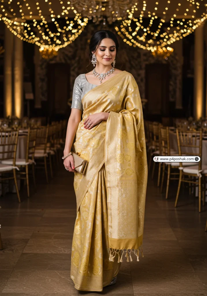 This champagne gold Banarasi silk saree with a silver border offers a luxurious look for evening receptions and formal gatherings. Its subtle shimmer exudes sophistication. Tip: Keep accessories minimal to highlight the saree’s richness.