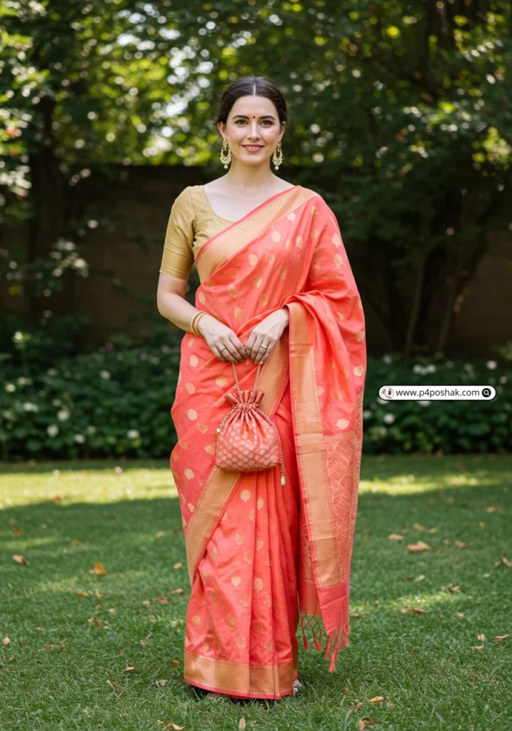 Shop Now from Amazon: Coral Pink Banarasi Silk Saree + Golden Blouse Piece + Gold Flats + Pink Sling Bag