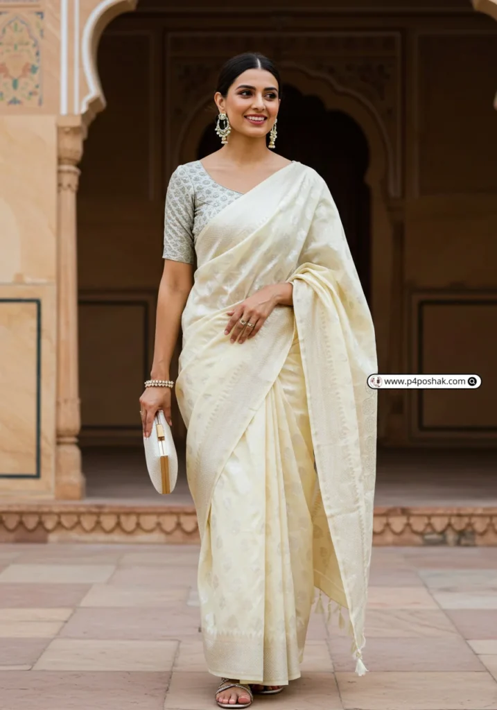 This off-white Banarasi silk saree with a silver zari border offers a minimalist and elegant look, suitable for formal gatherings and evening parties. Personal tip: Pair with subtle statement earrings to complete the look.