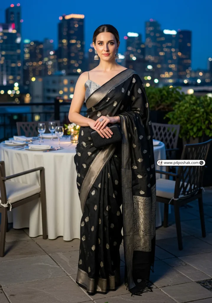 A black Banarasi silk saree with silver zari work is perfect for evening parties and formal gatherings. Its versatility allows for multiple styling options, making it a chic wardrobe staple.