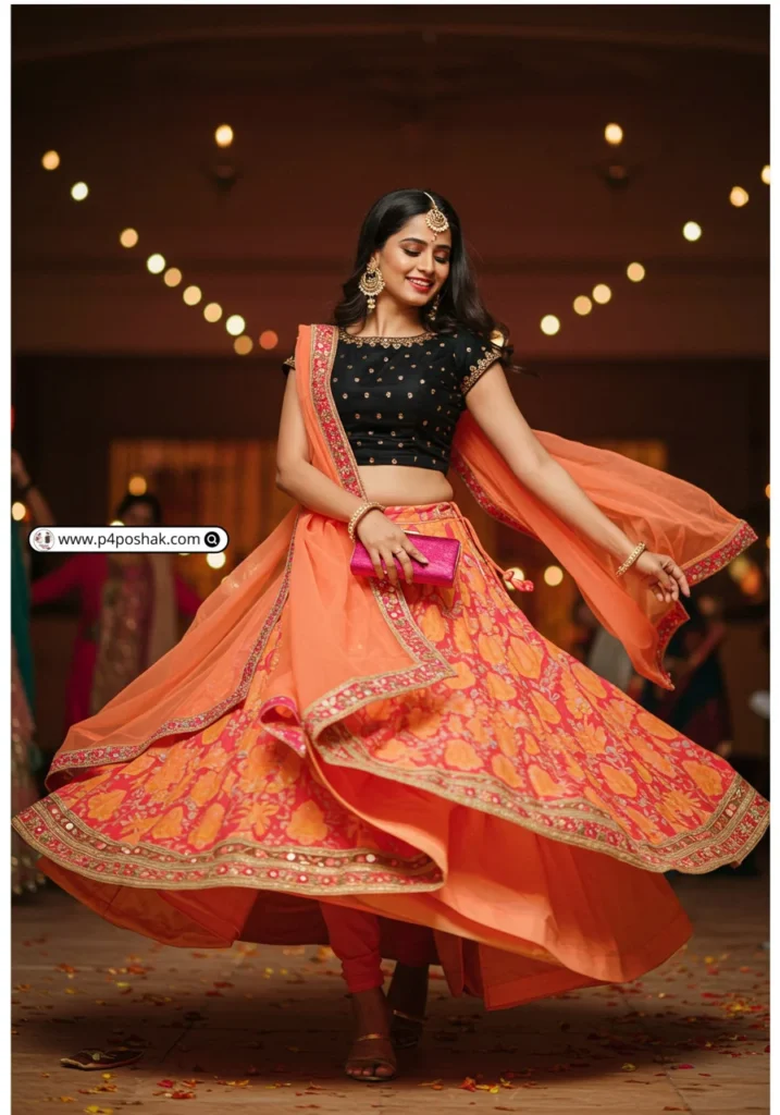 Bright and cheerful, this black choli with pink-orange lehenga adds energy to your Navratri look. Lightweight and breathable, perfect for long dance nights. According to Femina India, bold color combos are a festive trend.