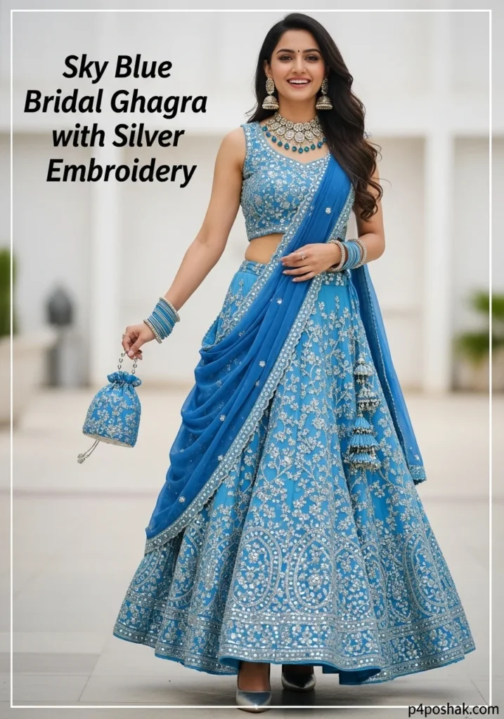 15. Sky Blue Bridal Ghagra with Silver Embroidery