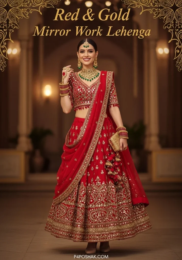 Mirror work adds sparkle to this vibrant bridal lehenga. Ideal for evening wedding celebrations, the lehenga balances traditional charm with modern elegance. I recommend pairing it with gold bangles for a festive look.