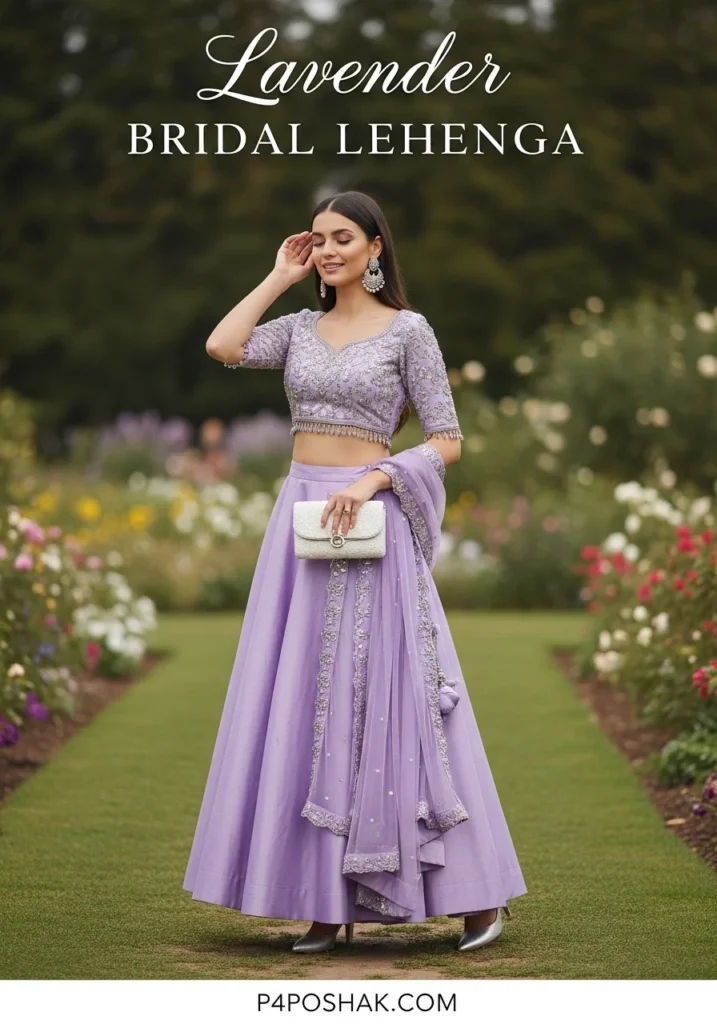 12. Lavender Bridal Lehenga with Silver Embroidered Blouse + Silver Heels + White Clutch