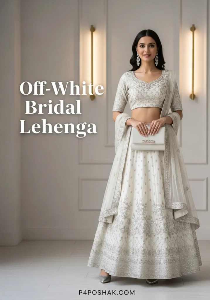 14. Off-White Bridal Lehenga with Silver Thread Blouse + Silver Heels + White Clutch