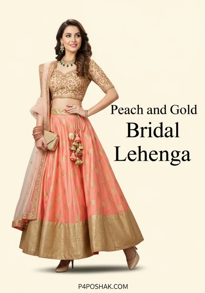 Peach and gold create a fresh, festive appearance. Perfect for daytime ceremonies, the lehenga is comfortable yet stylish. Tip: Soft curls and minimal jewelry elevate this bridal look effortlessly.