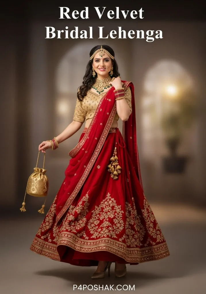 Shop Now from Amazon: Red Velvet Lehenga + Golden Blouse + Beige Heels + Gold Potli