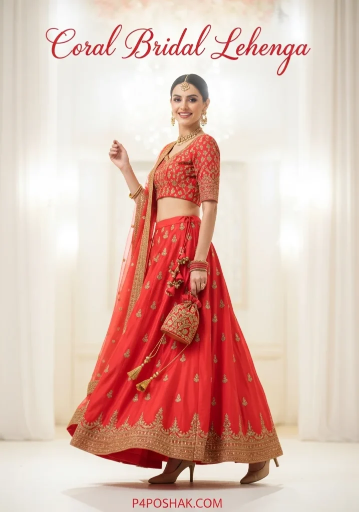 20. Coral Lehenga with Golden Thread Blouse + Beige Heels + Gold Bag