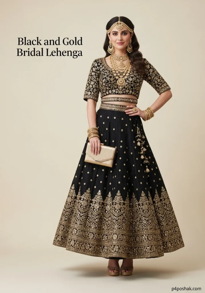 21. Black and Gold Bridal Lehenga with Embroidered Blouse + Beige Heels + Gold Clutch