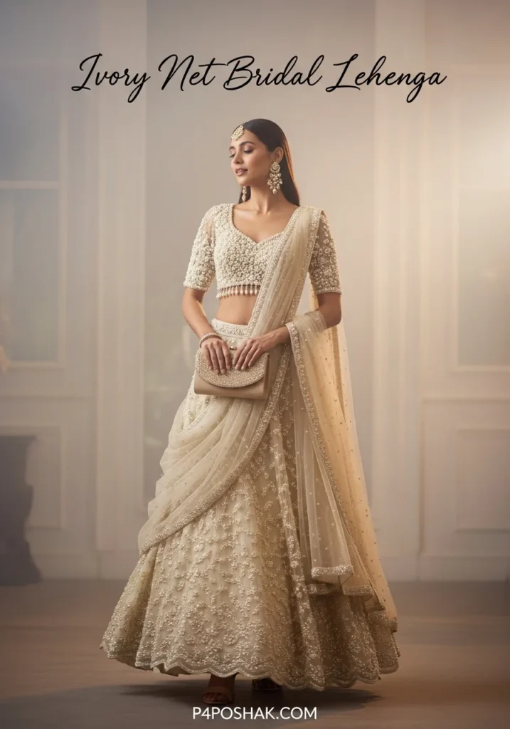 The ivory net lehenga with pearl embellishments creates an ethereal, princess-like look. Perfect for modern brides seeking elegance with comfort. Tip: Soft pastel accessories enhance the delicate feel of this outfit.