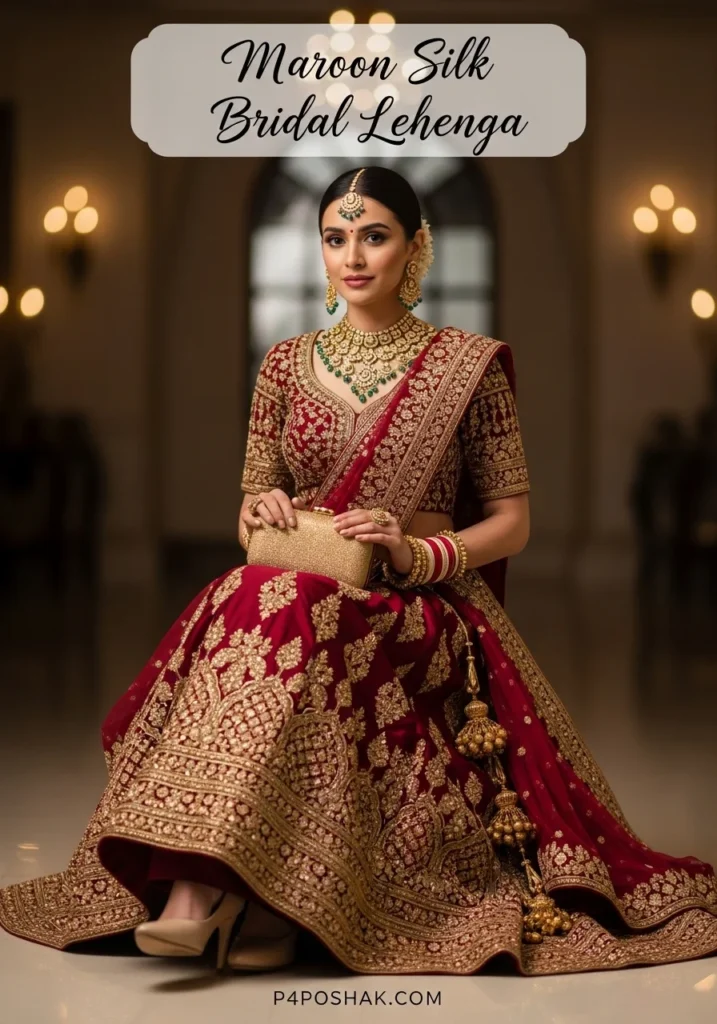 Traditional silk with golden zari detailing makes this bridal lehenga perfect for evening weddings. The fabric drapes beautifully, ensuring both style and comfort. I suggest pairing with bold gold jewelry for a statement look.