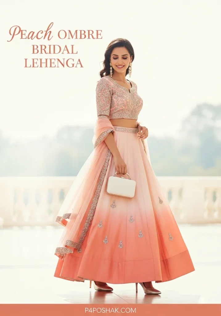 Ombre peach adds freshness and vibrancy for daytime weddings. Lightweight fabric ensures comfort while dancing or moving around. Tip: Add subtle pearl earrings to complement the silver embroidery.