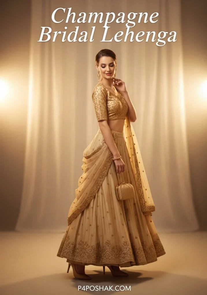 7. Champagne Bridal Lehenga with Golden Blouse + Beige Heels + Gold Clutch