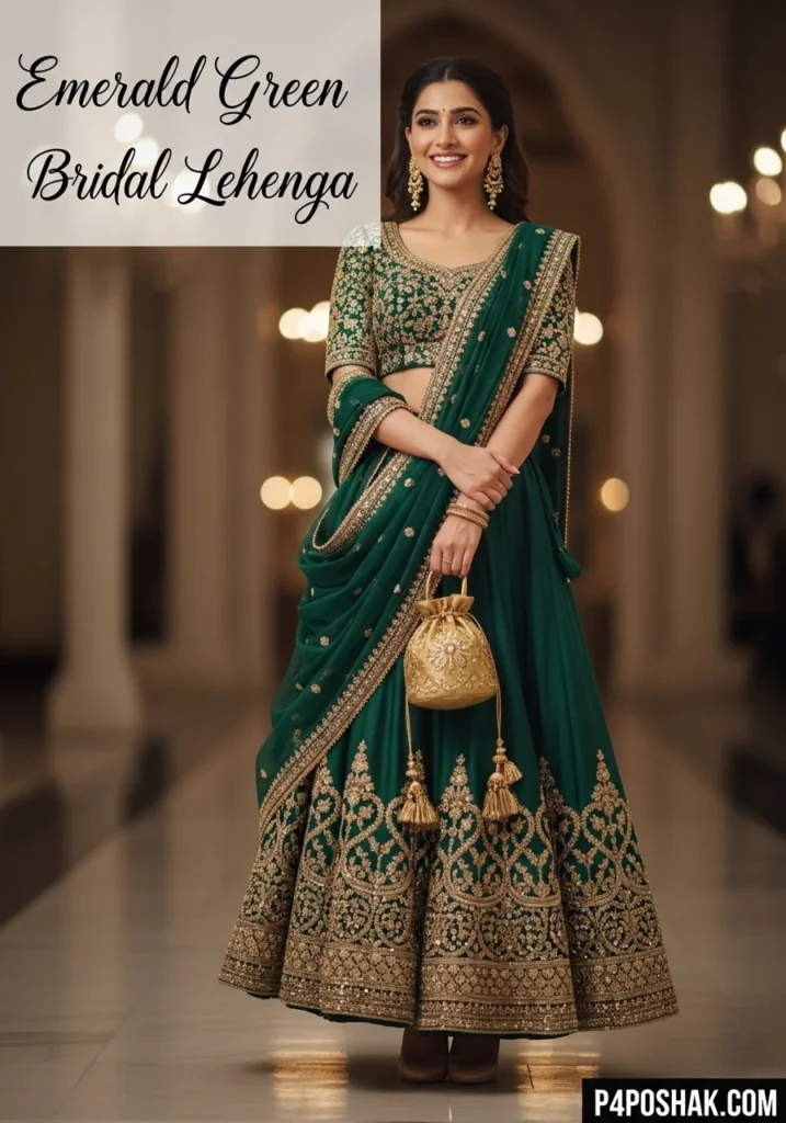 8. Emerald Green Bridal Lehenga with Gold Embroidered Blouse + Beige Heels + Gold Potli