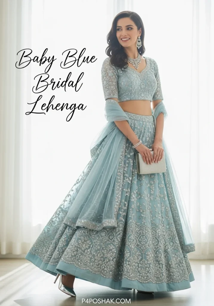 Baby blue bridal lehenga offers a serene and elegant vibe. Soft fabric ensures all-day comfort, and silver accents add subtle glamour. Tip: Pair with pastel makeup for a cohesive bridal look.