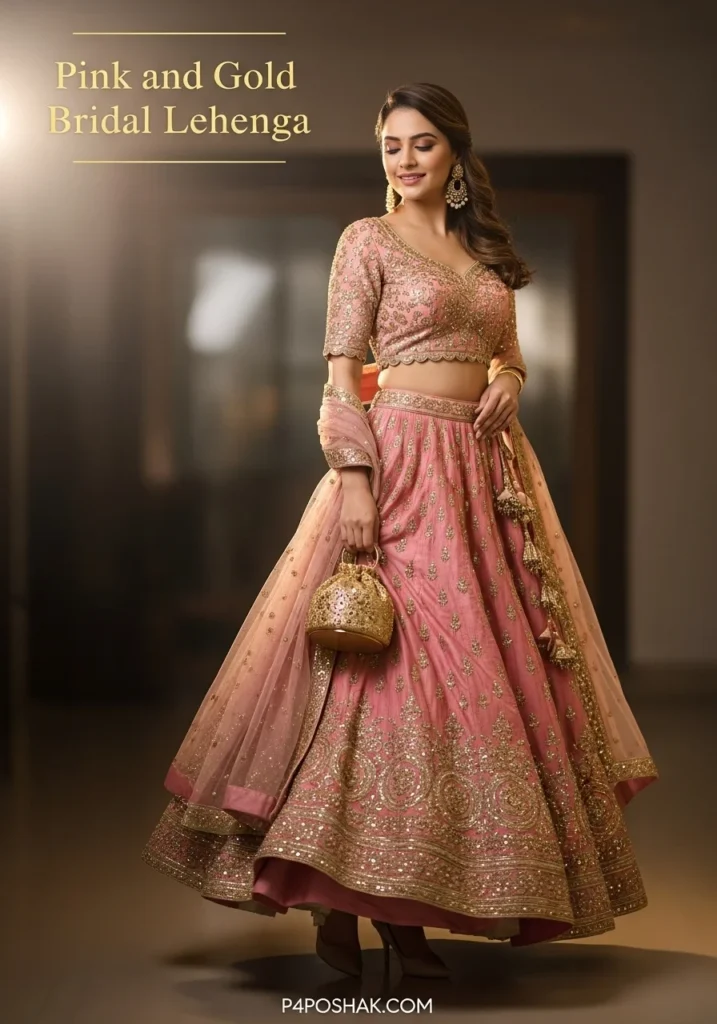 10. Pink and Gold Bridal Lehenga with Embroidered Blouse + Beige Heels + Gold Bag